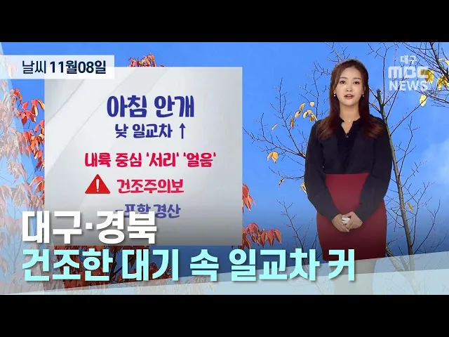 요즘 아침에는 안개가, 낮에는 일교차가 크게 벌어지고 있습니다.지난 11월 6일 대구에는 평년보다 나흘 빨리 첫 얼음이 얼었는데요. 큰 일교차 속 오늘 아침과, 내일 새벽부터~아침 사이에는 내륙에 서리가 내리는 곳이 있겠고요, 높은 산지에는 얼음이 어는 곳도 있겠습니다. 여기다 건조함도 더해져 11월 8일인 오늘도 ...