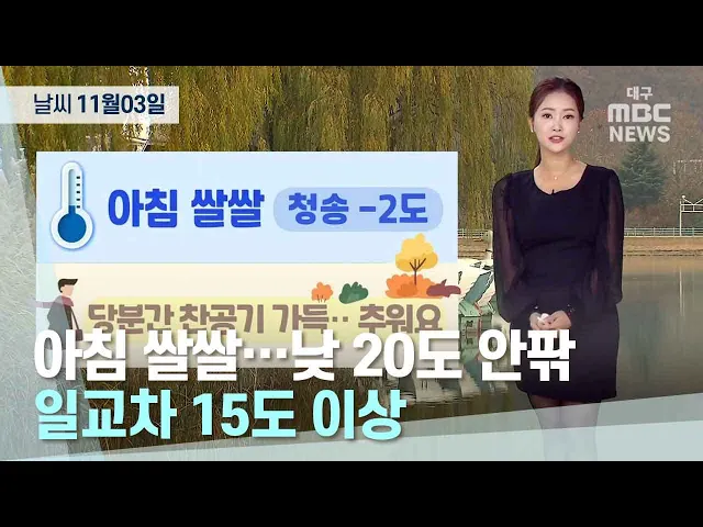 다음 주 절기 '입동'을 앞두고 찬 공기가 가득해지고 있습니다.11월 3일 아침 대구와 경북 대부분 지역 어제보다 기온 낮게 출발하는데요. 청송은 -2도까지 뚝 떨어져 쌀쌀하겠습니다. 3일 낮부터는 북서쪽에서 본격적으로 찬 공기가 남하하면서, 11월 4일과 11월 5일은 더 춥겠는데요. 당분간 아침에는 내륙에서 영하의 기...