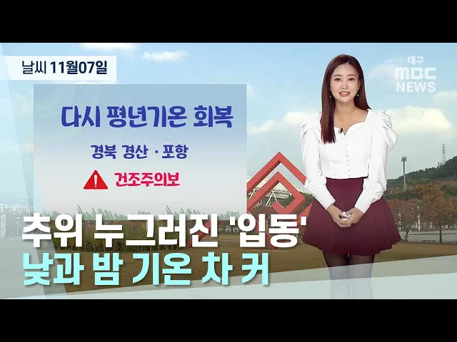 11월의 첫 번째 주말인 5일 대구와 경북지역은 건조한 가운데 일교차 큰 날씨를 보이고 있습니다. 아침 최저기온은 영하 7도에서 영상 4.6도로 전날보다 3~4도가량 낮았습니다. 낮 기온은 12~16도로 일교차가 10도 안팎으로 크겠습니다. 6일은 아침 기온 영하 3도에서 6도, 낮 기온은 14~18도로 5일보다 조금 오르겠습니다...
