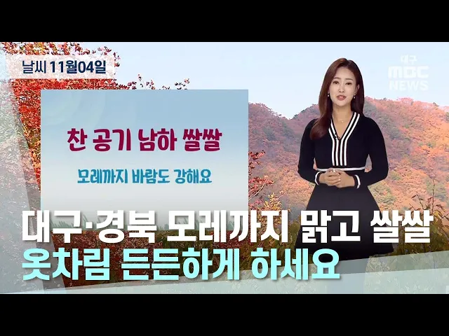 11월 4일 오늘도 차가운 공기가 옷 속을 깊게 파고듭니다.북서쪽에서 남하한 찬 공기의 영향으로 내일까지 아침 기온이 낮아 춥겠는데요. 전국적으로 쌀쌀한 날씨가 예상됩니다. 우리 지역 오늘과 내일 아침 기온은 평년보다 3~6도가량 낮겠고요. 경북 내륙을 중심으로 바람도 약간 강하게 불어 체감온도는 더욱 낮아 춥겠...