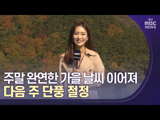 ◀앵커▶10월의 마지막 주말이 다가오면서 아침, 저녁으로 추위를 느낄 만큼 계절이 바뀌고 있습니다.청명한 가을 날씨 속에 대구 팔공산에는 단풍이 절정인데요,주말 날씨, 유하경 기상캐스터가 전해드립니다.◀기자▶쾌청한 가을 하늘 아래 전국 곳곳에서 단풍이 물들어가고 있습니다.대구에도 대표적인 단풍명소인 팔공산이 ...