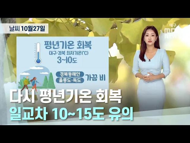 쌀쌀함이 조금 잦아들었습니다.오늘(27일) 대구와 경북의 아침 기온 3도에서 10도로 어제보다 올랐는데요. 어제까지 영하권 보이던 곳도, 모두 영상권으로 회복하며 평년과 비슷하게 시작합니다. 오늘(27일)은 구름 많다가 오전부터 차차 맑아지겠습니다. 동풍의 영향을 받는 경북 동해안과 울릉도·독도는 대체로 흐린 가운...