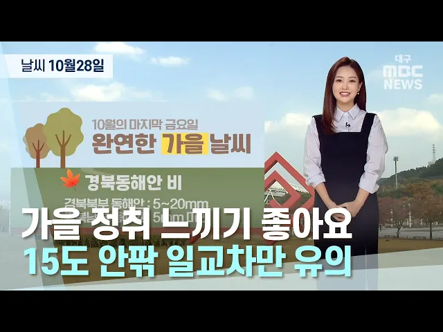 10월 28일 대구·경북은 가끔 구름 많겠고 동해안에는 비가 내리는 곳이 있겠습니다.경북 북부 동해안에는 29일까지 5에서 20mm, 포항과 경주 등 남부 동해안에는 5mm 미만의 비가 내리겠습니다.28일 아침 최저기온은 대구 6.5, 안동 5.4, 포항 10.5도를 기록했고, 낮 최고기온은 대구 20도 등 16도에서 21도로 예상됩니다.3...