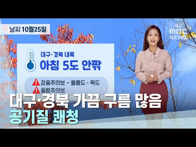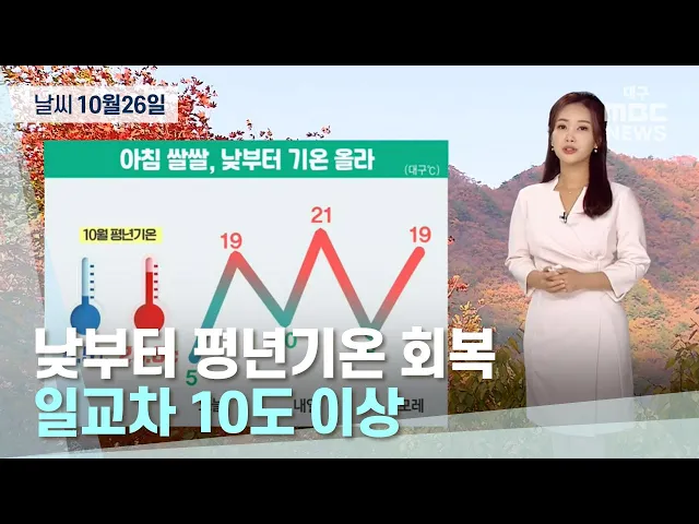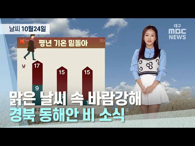 가을의 마지막 절기 '상강'이 지나니 바람결이 좀 더 차가워졌습니다,하늘빛은 대체로 맑지만, 찬 공기가 강하게 남하하면서 내일(25일)까지 평년보다 낮은 기온 예상되는데요. 오늘(24일) 대구의 아침기온 9도, 안동 5도, 김천 1도선으로 시작합니다. 낮 기온도 주춤하며 대구 17도 안동과 김천은 15도선에 머물겠습니다. ...
