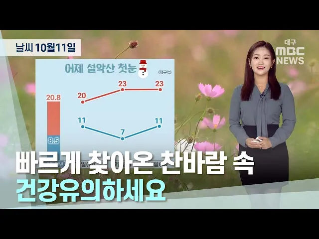어제(10일) 설악산에는 작년보다 9일 일찍 올해 첫 눈이 내렸습니다.우리지역도 최근 북서쪽에서 찬 공기가 유입되면서 기온이 떨어져, 작년 이맘때보다도 쌀쌀한데요. 오늘(11일) 대구의 아침기온은 11도로, 한 자릿수 보이며 출발하는 곳 많습니다. 낮에는 20도에 머물며 대부분 지역에서 평년보다 1-4도가량 낮겠습니다....