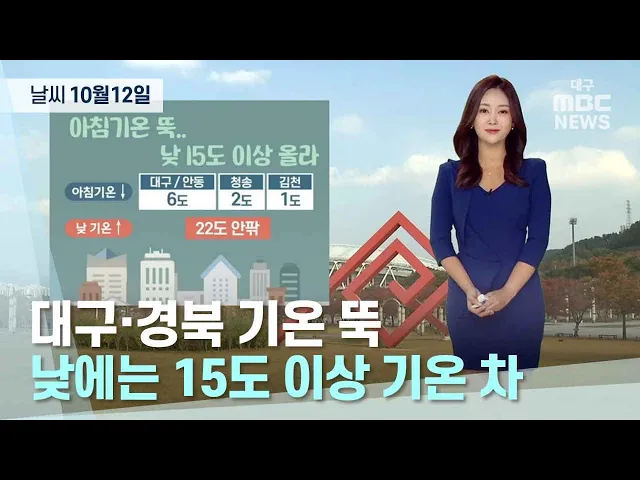 10월 11일 대구와 경북 지역은 흐리다 차차 맑아지겠고 기온이 평년보다 떨어져 쌀쌀하겠습니다.아침 최저기온은 대구 10.8, 안동 6.8, 포항 11.1도로 10일보다 2~3도 낮습니다.낮 최고기온은 대구 20도 등 16도에서 21도까지 올라 10일보다 높겠습니다.12일은 아침 최저기온이 대구 7도 등 2도에서 9도로 11일보다 2도에서...