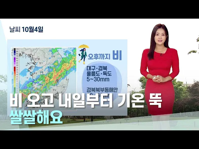 10월 4일 대구·경북 지역은 기압골의 영향으로 대부분 지역에서 비가 오고 있습니다.3일부터 내린 비의 양은 상주 51.1, 문경 47.5mm 등 경북 북부지방을 중심으로 많이 내렸고 대구는 4.1mm를 기록하고 있습니다.4일 예상 강수량은 경북 북부 동해안에 20~60mm, 그외 대구와 경북에 5~30mm이며 비는 오후에 대부분 그치겠...