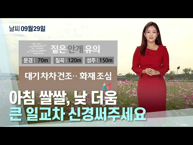 9월 29일 대구와 경북은 대체로 맑겠습니다.청도와 성주, 칠곡, 문경 등 경북 내륙에는 아침까지 가시거리 200m 미만의 짙은 안개가 낀 곳이 많겠습니다.29일 아침 최저기온은 대구 13.7, 안동 12.8, 포항 16.6도를 기록했습니다.낮 최고기온은 대구 28도, 경북 25도에서 29도까지 오르겠습니다.대구지방기상청은 "10월 1일...