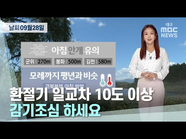 대구·경북은 가끔 구름 많겠습니다. 군위와 봉화 등 내륙에는 아침까지 짙은 안개가 끼는 곳이 있겠습니다.아침 최저기온은 대구 14.8, 안동 12.2, 포항 17.1도를 기록했고, 낮 최고기온은 대구 26도 등 24도에서 26도로 예상됩니다.당분간 아침 기온이 경북 북부 내륙을 중심으로 10도 안팎까지 떨어져 쌀쌀하겠고, 일교차...