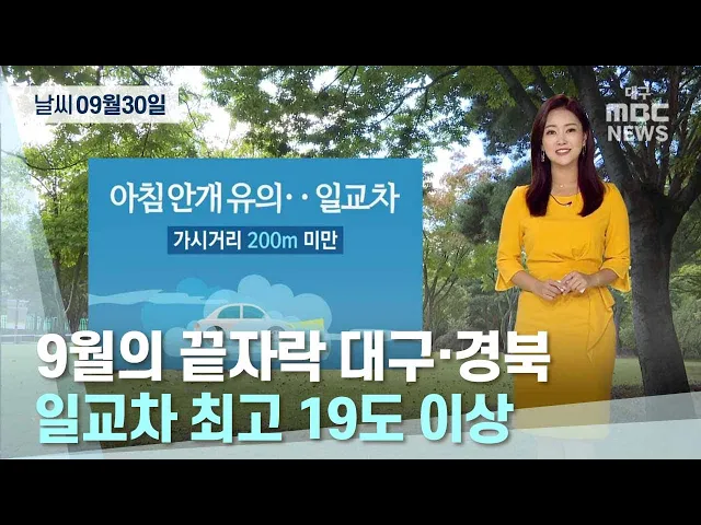9월 30일 대구와 경북은 대체로 맑겠습니다. 영천과 군위, 고령 등 경북 내륙을 중심으로 오전까지 가시거리 200m 미만의 짙은 안개가 끼는 곳이 많겠습니다.30일 아침 최저기온은 대구 14.1, 안동 12.8, 포항 17도를 기록했습니다.낮 최고기온은 대구 29도 등 26도에서 29도까지 올라 일교차가 15도 이상 크겠습니다.미세...