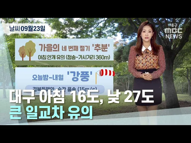 낮과 밤의 길이 같아지는 절기상 추분인 9월 23일, 대구·경북 지역은 구름이 많고 일교차가 크겠습니다.낮 최고 기온은 대구 27도, 경산 28도 등 23~28도까지 오르며 전날보다 3도가량 더 높겠습니다.미세먼지와 초미세먼지 농도는 '좋음' 수준이 예보됐습니다.오후부터는 바람이 강하게 부는 곳이 많겠습니다.주말은 내내 ...