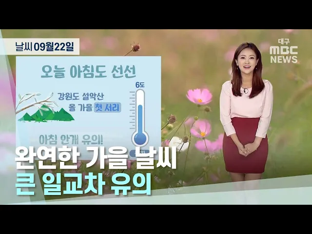 9월 22일 대구 경북은 가끔 구름 많겠습니다. 아침 최저기온은 대구 11.6, 안동 9.9, 포항 15.1도로 21일과 비슷하거나 조금 낮습니다.낮 최고기온은 대구 25도 등 23도에서 25도로 예상됩니다.당분간 내륙을 중심으로 낮과 밤의 기온차가 10에서 15도로 크겠습니다.23일 밤부터 24일 사이 울릉도, 독도와 경북 동해안에는 ...