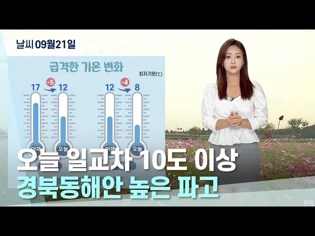 오늘(21일)도 아침에는 선선하게 시작합니다.대구의 기온 12도로 어제보다도 5도 가량 기온이 낮아졌는데요. 봉화의 기온은 어제 12도에서 8도 보이며, 10도 안팎의 급격한 기온변화가 나타났습니다. 이제 본격적인 가을날씨가 이어지는 만큼, 옷차림 신경 잘 쓰셔야겠습니다. 경북 동해안 지역은 오늘까지 '풍랑특보'가 이...