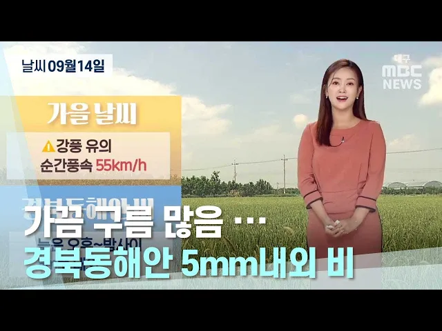 요즘 정말 가을과 딱 어울리는 날씨죠.계속해서 적당한 바람과 따뜻한 햇살이 펼쳐지고 있습니다. 오늘(14일) 대구와 경북내륙, 울릉도와 독도에는 강풍이 예상됩니다. 순강풍속 시속 55km의 강한 바람이 부는 곳이 있어 시설물 관리와 안전사고에 각별히 유의하시기 바랍니다. 동풍의 영향을 받는 경북동해안에는 오늘(14...