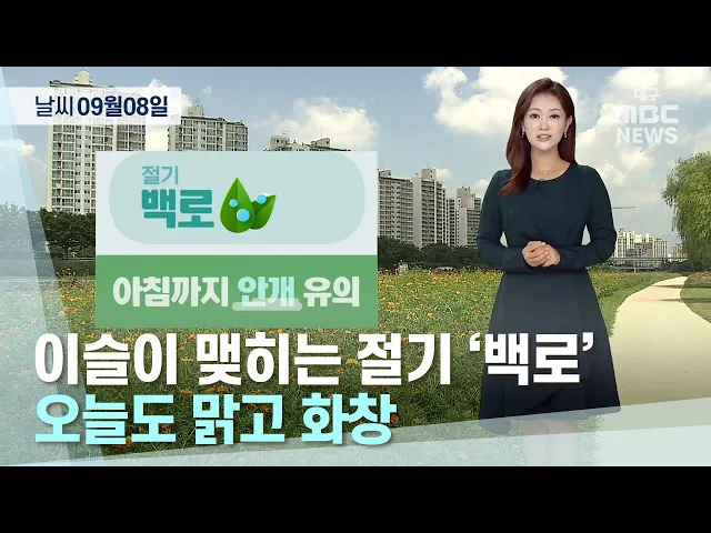 오늘(8일)은 '이슬이 맺히기 시작'한다는 절기 '백로'입니다.대개 '백로'가 지나면, 가을이 본격적으로 시작하는 시기라고 하는데요. 최근 맑게 드러난 청명한 하늘을 바라보면, 가을기운을 물씬 느낄 수 있습니다. 다만 이 때쯤 밤 기온이 급격히 내려가 안개가 자주 끼는데요. 오늘(8일)도 아침까지는 경북내륙을 중심으...