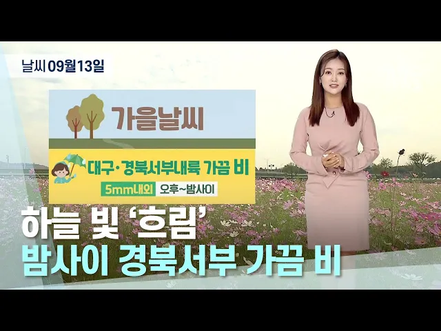 9월 13일은 대체로 흐린 가운데 대구와 경북 서부에는 오후부터 밤사이 가끔 비가 내리는 곳이 있겠습니다.예상 강수량은 5mm 안팎입니다. 아침 최저기온은 대구 21.3, 안동 19.2, 포항 21.9도로 평년보다 조금 높습니다.낮 최고기온은 대구 26도 등 24도에서 27도로 평년과 비슷하겠습니다.아침까지 경북 내륙에는 가시거...