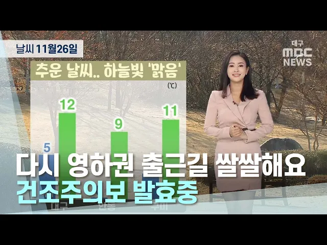 1주말동안 화창한 날씨가 이어졌습니다오늘은 벌써 11월의 마지막 월요일인데요 현재 대부분 지역에서 영하권으로 출발하고 있는데요. 월요일 출근길 큰 추위는 없겠습니다.한낮에는 예년 기온을 웃도는 날씨를 보이며 16도 안팎까지 기온이 오르겠습니다. 다만 건조함에는 대비를 하셔야겠습니다 건조한 대기가 이어지면서...