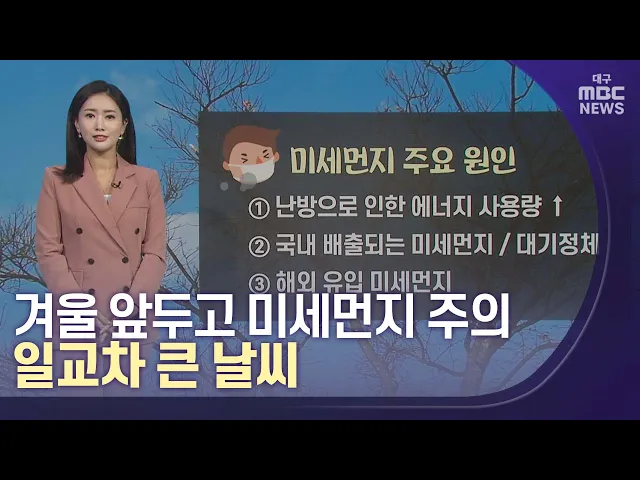 ◀앵커▶날씨가 추워지면 어김없이 찾아오는 불청객, 하늘을 온통 뿌옇게 뒤덮는 미세 먼지입니다.지난 21일 대구에는 초 미세 먼지 주의보가 발령되기도 했는데요.겨울을 앞두고 다시 시작된 미세 먼지 발생에 대비 잘 하셔야겠습니다.이번 주말은 아침에는 춥겠지만, 낮에는 기온이 오르겠습니다.다음 주도 이번 주와 비슷...