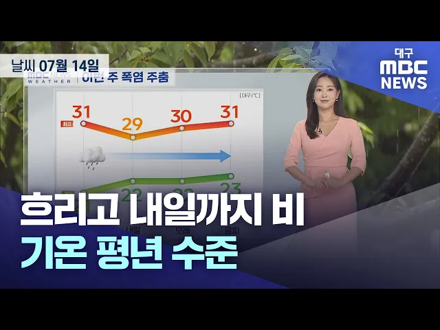 7월 14일 월요일 대구와 경북 지역은 대체로 흐린 가운데 가끔 비가 내리겠습니다.화요일까지 예상 강수량은 20~60mm입니다. 낮 최고 기온은 대구와 고령 31도, 김천 30도 등 26도에서 31도로 전날보다 1~3도가량 낮겠습니다. 미세먼지와 초미세먼지 농도는 '좋음' 수준을 보이겠습니다. 화요일은 오후까지 비가 이어지겠고...