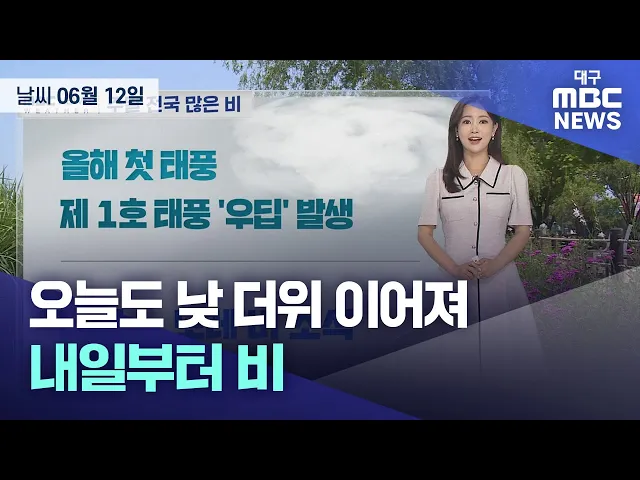 6월 12일은 목요일은 가끔 구름이 많은 가운데 초여름 더위가 이어졌습니다.낮 최고 기온은 대구 31.7도, 칠곡 31.2도, 고령 30도 등을 보였습니다.금요일은 대체로 흐리겠고 늦은 오후부터 비가 내리기 시작하겠습니다.비는 토요일까지 이어지겠고, 예상 강수량은 20~80mm입니다.아침 최저 기온은 대구 18도 등 14도에서 1...
