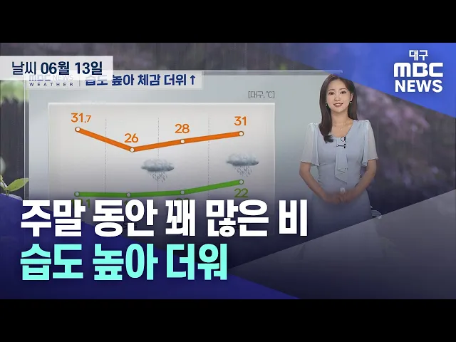 6월 2주 차 대구·경북 주말 ‘날씨 체크’ 이번 주 주말 날씨 포인트 3가지 전해드립니다.▶ 첫 번째! '비 소식'첫 번째 포인트 ‘비 소식’입니다.33도를 훌쩍 넘는 더위가 이어졌던 이번 주! 금요일 늦은 오후부터 비가 내리기 시작해 토요일 저녁까지 이어지겠고요. 예상되는 비의 양은 20~80mm입니다. 또! 일요일에도 비가 ...