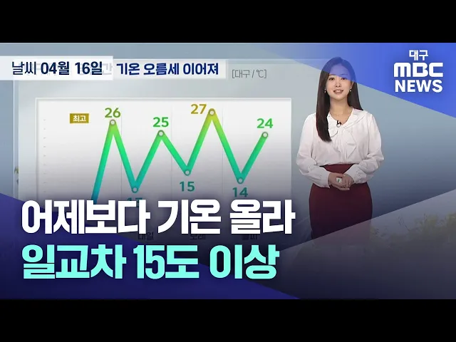 4월 16일 수요일 대구와 경북 지역은 구름이 많은 가운데 한낮에는 초여름 같은 날씨를 보이겠습니다. 낮 최고 기온은 대구 26도, 청도 25도, 김천 27도 등 21도에서 27도로 전날보다 9~10도가량 높겠습니다. 미세먼지 농도는 '보통', 초미세먼지 농도는 '좋음' 수준이 예보됐습니다. 목요일도 구름이 많겠고 낮과 밤의 기...