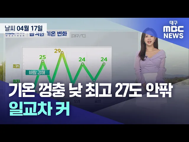 4월 17일 금요일 대구와 경북 지역은 대체로 흐린 가운데 일교차가 15도 안팎으로 크겠습니다.아침 최저 기온은 대구 12.2도, 안동 7.5도, 포항 15도 등을 보였습니다.낮 최고 기온은 대구 25도, 김천 27도, 고령 23도 등 21도에서 27도로 전날과 비슷하겠습니다.대구지방기상청은 대부분 지역에서 순간풍속 시속 55km 안팎...