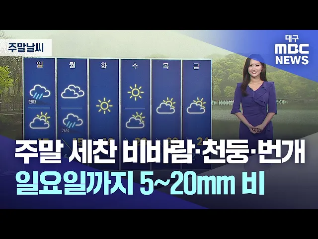 이번 주는 평년 기온을 웃돌며 정말 포근했습니다.활짝 핀 봄꽃 구경도 많이 하셨나요?아쉽지만 이번 주말 세찬 비 소식이 지난 뒤 봄꽃은 많이 떨어지겠습니다.토요일 오후부터 모레 새벽 사이 대구와 경북에는 5~20mm의 비가 예상되고요.비와 함께 돌풍, 천둥, 번개가 치는 곳도 있겠습니다.특히 토요일 밤부터 우리 지역...