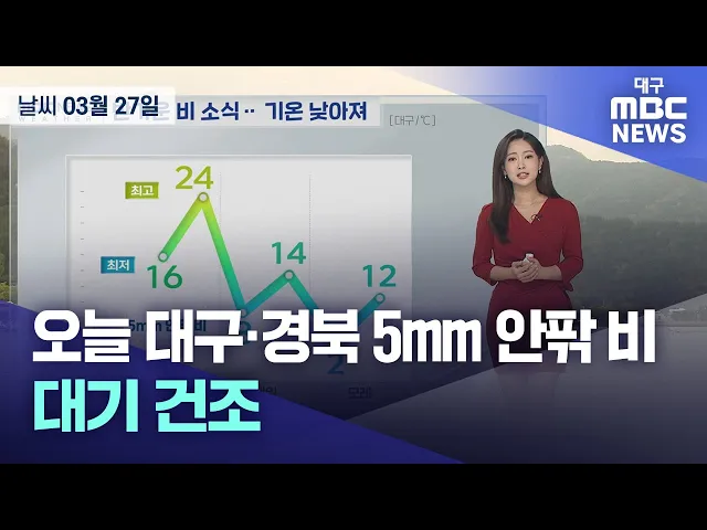 3월 27일 목요일 대구와 경북 전역에 건조특보가 발효 중인 가운데 저녁까지 가끔 비가 오겠습니다.예상 강수량은 5mm 미만입니다.아침 최저 기온은 대구 16.5도, 안동 9.8도, 포항 15.7도 등을 보였습니다.낮 최고 기온은 대구 24도, 청도 23도, 구미 24도 등 19도에서 25도를 보이겠습니다.칠곡에는 강풍주의보가 내려져 ...