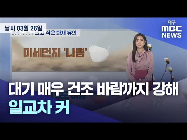 3월 26일 수요일 대구와 경북 지역은 대기가 매우 건조한 가운데 일교차가 15도 안팎으로 크겠습니다.군위를 제외한 대구와 경북 동해안, 구미, 경산 등에는 건조경보가, 그 밖의 지역에는 건조주의보가 발효 중입니다.아침 최저 기온은 대구 8.6도, 안동 4.6도, 포항 11.9도 등을 보였습니다.낮 최고 기온은 대구 25도, 김...