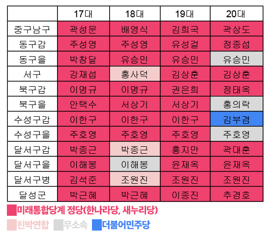 아래 그림은 17~20대 총선에서 대구 지역구에 출마한 후보들의 소속 정당을 미래통합당계/더불어민주당계/무소속 등으로 나눠 색깔별로 정리한 것입니다.