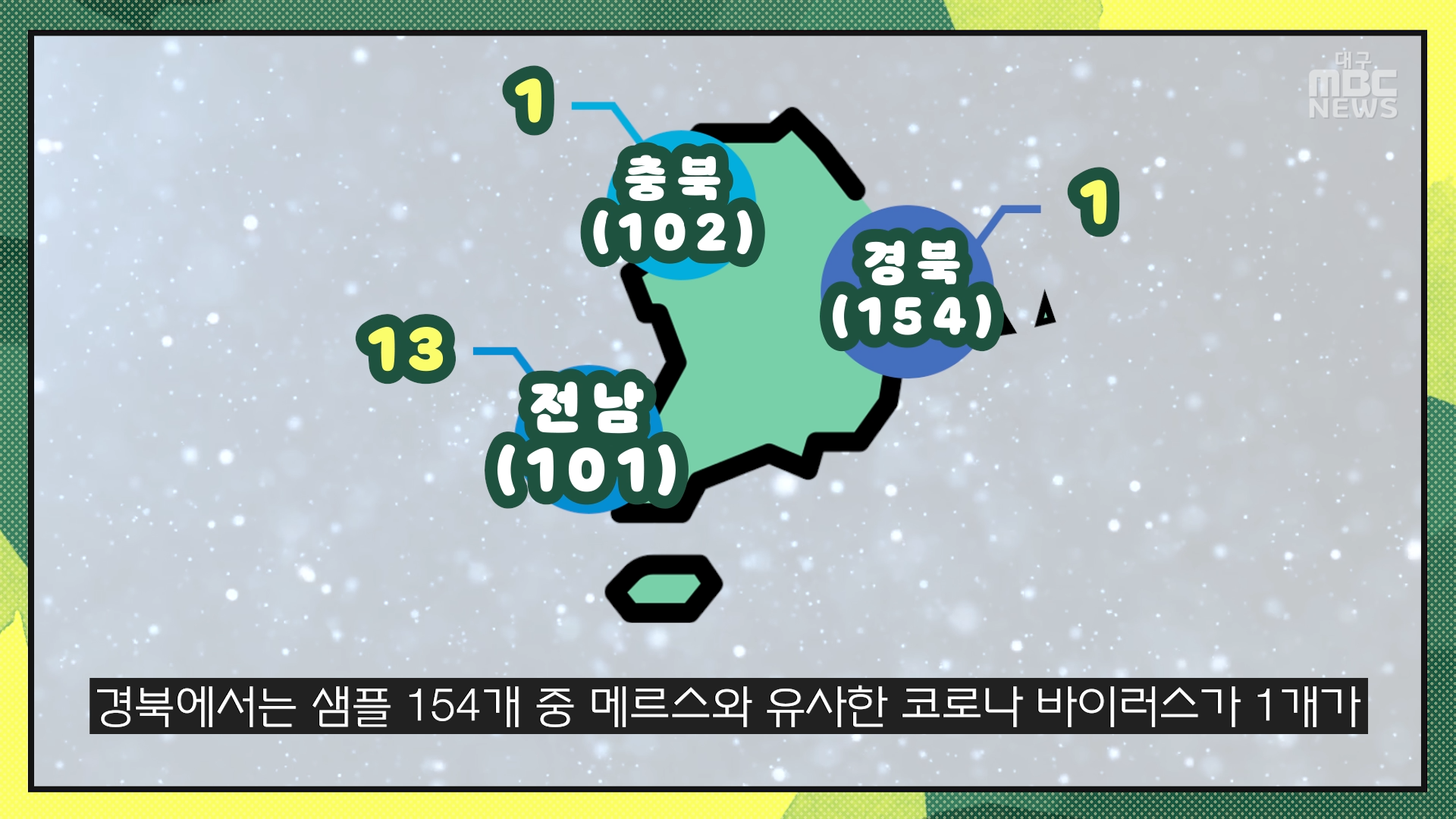 이러한 감염병 전파의 위험성을 가진 박쥐 과연 국내는 박쥐로부터 안전할까요? 현재 국내에서는 총 23종의 박쥐가 서식하는 것으로 알려져 있습니다. 환경부 국립환경과학원에서 국내에 서식하는 박쥐의 구강스왑, 배설물, 사체, 소변을 조사한 결과 전남에서는 샘플 101개 중 사스와 유사한 코로나 바이러스가 13개, 충북에서는 샘플 102개 중 메르스와 유사한 코로나 바이러스가 1개, 경북에서는 샘플 154개 중 메르스와 유사한 코로나 바이러스가 1개 검출되는 등 국내도 코로나 바이러스로부터 안전지대가 아니라는 연구결과가 나왔습니다.