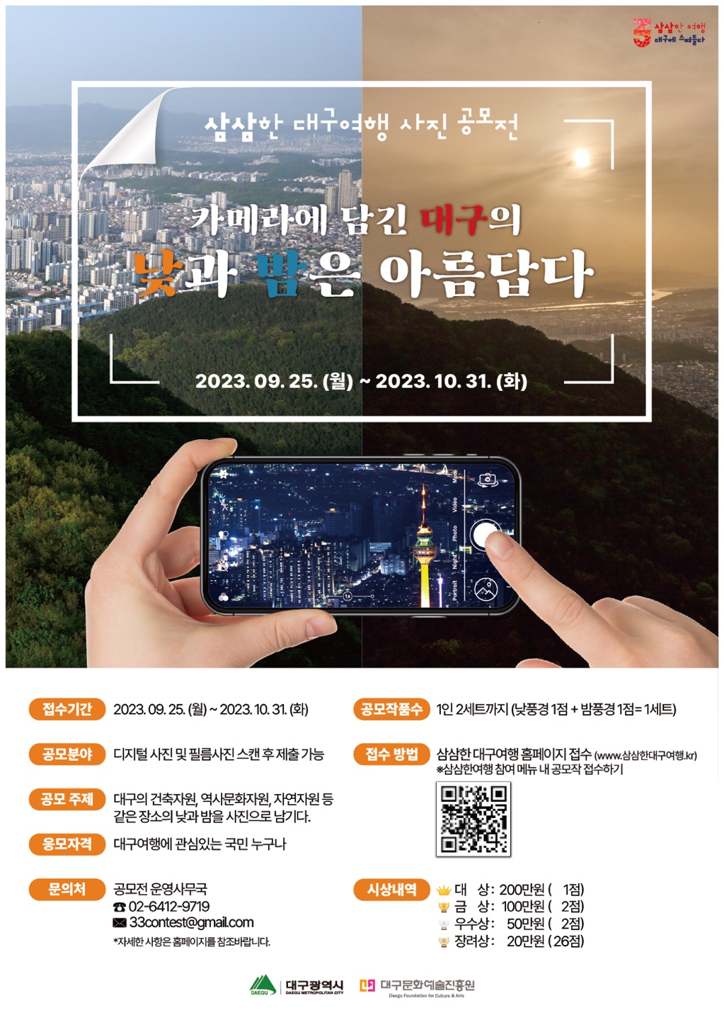 대구문화예술진흥원은 건축, 역사 문화, 관광 등 대구의 3대 문화 관광자원과 여행지를 알리는 사진 공모전을 엽니다.낮 풍경 사진 1점과 밤 풍경 사진 1점을 한 세트로 구성해 1인당 최대 2세트까지 참여할 수 있습니다. 10월 31일까지 대구여행 홈페이지를 통해 접수하면 서면 심사로 1차 작품을 선별한 뒤 대구여행 홈페...