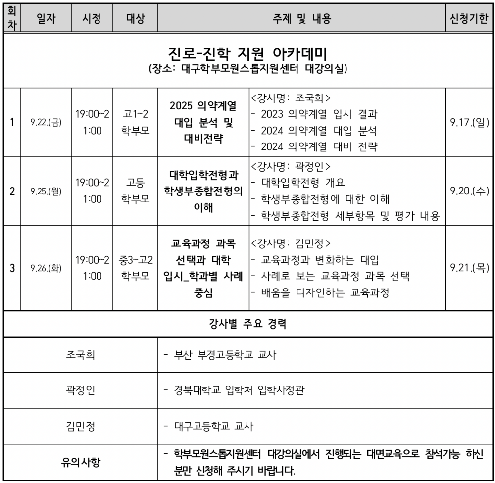 사진 제공 대구학부모원스톱지원센터대구 학부모 원스톱 지원센터는 학부모에게 진로 진학에 대한 정보를 제공하는 '진로 진학 지원 아카데미'를 오는 9월 22일, 25일, 26일 저녁 7시부터 9시까지 센터 대강의실에서 운영합니다.고등학교 교사, 대학교 입학사정관 등이 강사로 나와 2025년 의약 계열 대입 분석 및 대비 전...