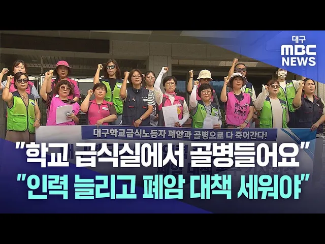 대구 학교 급식실 인력 충원 요구대구시교육청이 2학기부터 학교 급식실에 방역, 소독, 청소를 하는 방역 도우미 지원 사업을 중단합니다.코로나 단계가 하향된 데 따른 조치라고 밝혔습니다. 이에 대해 급식실 종사자들은 노동 환경이 더욱 열악해진다며 개선 대책을 요구하고 있습니다. 방역 도우미 사업 중단을 철회하든...