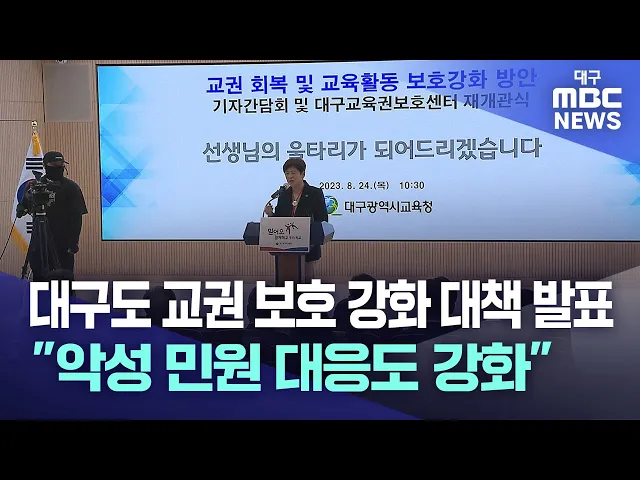 ◀앵커▶교권 침해가 점점 심각해지는 가운데 대구시 교육청이 8월 24일 교권 보호 강화 대책을 발표했습니다.8월 23일 교육부가 발표한 대책의 연장선으로 보이는데, 실효성 있게 작동되기 위해서는 교육 현장을 정확하게 파악하는 일이 중요하다는 지적이 나옵니다.이상원 기자가 보도합니다.◀기자▶대구시 교육청은 교권 침...