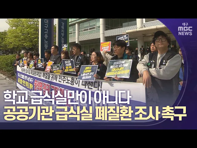 대구지역 학교 급식실 종사자의 건강검진에서 폐 질환 위험도가 높은 것으로 나타나면서 예방을 위한 건강검진을 전체 공공기관으로 확대해야 한다는 목소리가 나오고 있습니다.민주노총 대구지역본부는 4월 4일 대구지방고용노동청 앞에서 기자회견을 갖고 대구시와 8개 구·군, 산하 기관 등 구내식당이 있는 공공부문 51...