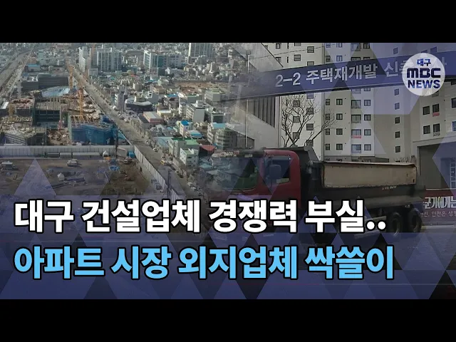 ◀ANC▶최근 대구에 신규 아파트 공급이 크게 늘고 있지만,공급 물량의 대부분을대구가 아닌 외지 건설업체들이 수주하고 있습니다.대구 건설업체의 경쟁력이 크게 약화했기 때문입니다.대책이 필요해 보입니다.보도에 이상원 기자입니다. ◀END▶ ◀VCR▶CG1]지난 2018년부터 지난해까지 3년 동안대구에 공급된 신규 ...