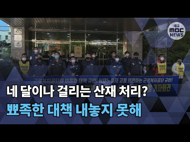 ◀ANC▶일하다 다치거나 병에 걸리는 노동자들에 대한 산재 처리에 넉 달이나 걸립니다.노동자들이 고통을 호소하고 있지만근로복지공단은 뾰족한 대책을내놓지 못하고 있습니다.이상원 기자가 보도합니다. ◀END▶ ◀VCR▶CG]근로복지공단에 따르면 업무상 질병 가운데 가장 발생 빈도가 높은근골격계 질병의 지난해 ...