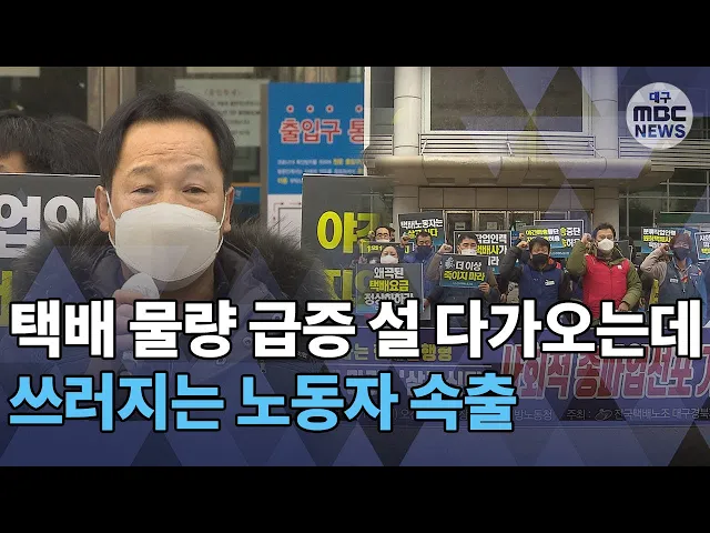 택배노동자들이 과로사 방지 대책을 요구하며총파업을 선언했습니다.민주노총 서비스연맹전국택배노동조합 대구경북지부는대구지방노동청 앞에서 기자회견을 열고 택배회사들이 약속한 분류 인력 투입 약속을 즉각 이행하라고 요구했습니다.택배사들이 지난해 10월 과로사 대책을 발표했지만현장에는 전혀 개선된 부분이 없...