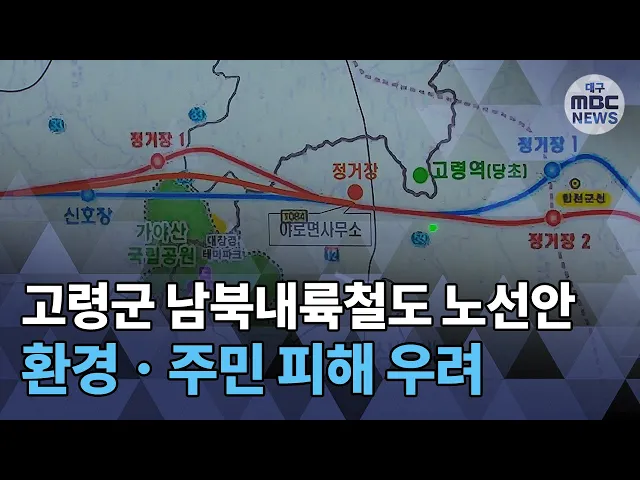 ◀ANC▶경북 김천과 경남 거제를 잇는남부내륙철도 신설역사 건립 계획에서고령군이 제외됐다는 소식 전해드렸는데요.고령군이 정부의 철도 노선안에 대해문제점을 제기했습니다.환경과 주민 피해가 우려된다며정부의 전략환경영향평가서에 제시된철도 노선을 다시 검토해 줄 것을요구하고 있습니다.이상원 기자가 보도합...