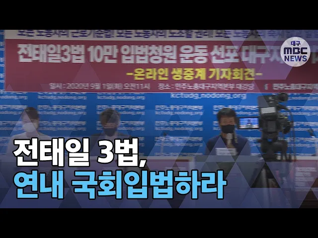 ◀ANC▶모든 노동자에게 노동자의 권리를 보장하고생명권을 보장하기 위한 이른바 전태일 3법 입법 실현을 위한 국회 국민 동의 청원이목표했던 10만 명을 달성했습니다.이에 따라 민주노총과 시민사회단체, 진보정당이 정부와 여당을 본격적으로 압박하고 나섰습니다. 이상원 기자가 보도합니다. ◀END▶ ◀VCR▶ ◀S...