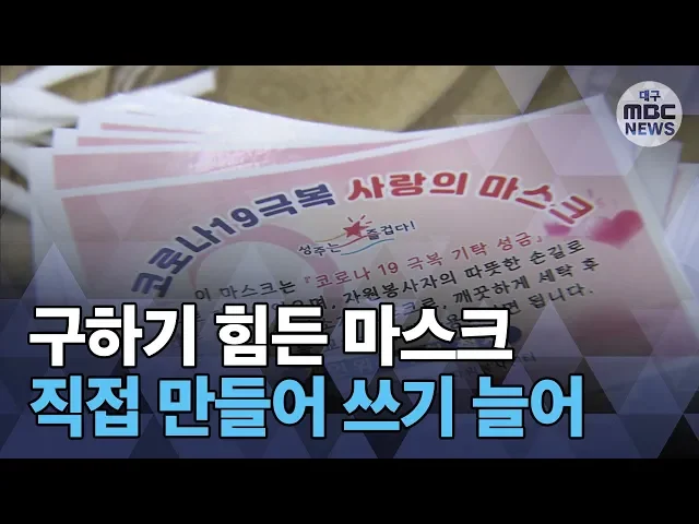 ◀ANC▶요즘 마스크 구하기가 가히 전쟁인데요.구하기도 힘들고, 값도 비싸다 보니직접 만들어 사용하려는 사람들이 늘고 있습니다. 이상원 기자가 보도합니다. ◀END▶ ◀VCR▶성주군에서 자원봉사자들이마스크를 만들고 있습니다.유기농 원단으로 된 천을 잘라마스크 모양을 만들고 재봉틀로 재단을 합니다.두 겹으로...