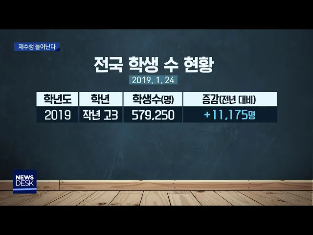 ◀ANC▶ 재수생들이 예년보다 늘고 있습니다. 지난해 수능이 불수능으로 불릴 만큼 어려웠기 때문이라고 합니다. 이상원 기자가 보도합니다. ◀END▶ ◀VCR▶ 최근 개강한 대구의 입시학원 재수선행반에는 지난해보다 10% 정도 지원자가 늘었습니다. 다음 달 개강하는 정규 반에 들어가려는 재수생 상담도 활발합니다. ...