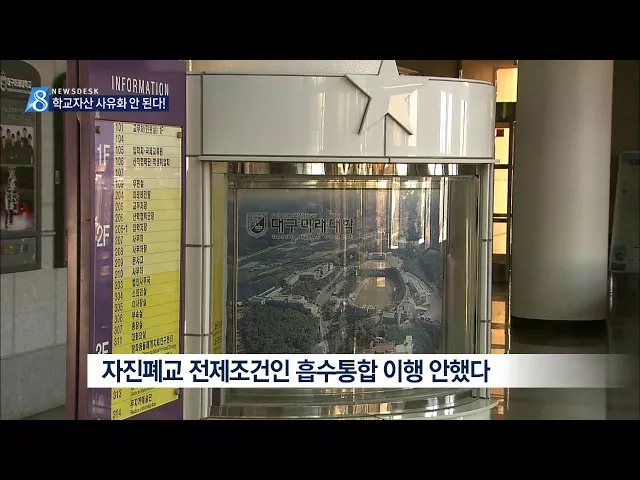 ◀ANC▶ 경영난으로 자진 폐교하는 대구미래대 학교법인이 당초 약속했던 대구대학교와의 흡수통합을 제대로 이행하지 않으면서 교수와 학교 법인간의 갈등의 골이 깊어지고 있습니다. 교수들은 학교법인측이 천억원에 이르는 자산을 유치원 경영을 빌미로 사유화하려 한다고 주장하고 있습니다. 권윤수 기자가 보도합니다...