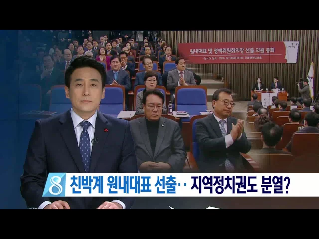 ◀ANC▶ 새누리당 신임 원내대표에 친박계 정우택 의원이 선출되면서 친박,비박간 계파갈등이 더욱 심화되는 양상입니다. 분당이 가시화되는 등 지역 정치권 분열은 더욱 빨라질 것으로 보입니다. 이상원 기자가 보도합니다. ◀END▶ ◀VCR▶ 박근혜 대통령 탄핵안 가결 이후 새누리당내 친박계와 비박계 계파갈등이 극...