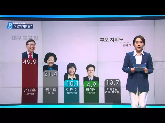 ◀ANC▶ 방금 보신것처럼 대구 북구갑은 후보 4명이 경쟁을 벌이고 있는데요. 지금까지의 여론은 어떨까요? 대구문화방송이 영남일보와 함께 실시하고 있는 대구경북 지역 격전지 여론조사. 북구갑의 결과를 알아봅니다. 권윤수 기자가 보도합니다. ◀END▶ ◀VCR▶ 대구 북구 갑 선거구에는 새누리당 정태옥 후보와 더...