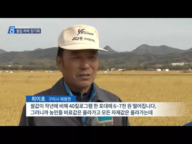 ◀ANC▶ 요즘 농촌 들녘에는 한 해동안 땀흘려지은벼를 수확하는 추수가 한창입니다. 하지만 쌀값이 계속 떨어지고 있어 수확의 기쁨보다 시름이 더 커지고 있습니다. 이상원 기자가 보도합니다. ◀END▶ ◀VCR▶ 구미시 해평면 들녘. 콤바인이 요란한 소리를 내면서 알차게 익은 벼를 수확하고 있습니다. 5년째 풍년이 ...