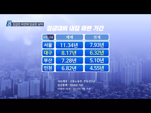 ◀ANC▶ 근로자가 월급을 받아 집을 사는데 얼마나 걸릴까요? 대구의 경우 집값은 비싸고 임금은 낮다보니 평균 8년 정도로 나타났는데, 서울을 빼고는 전국에서 가장 길었습니다. 이상원 기자가 보도합니다. ◀END▶ ◀VCR▶ 고용노동부와 부동산 114가 지난해 지역별 임금을 기준으로 전국 각 지역별로 중소형 아파트...