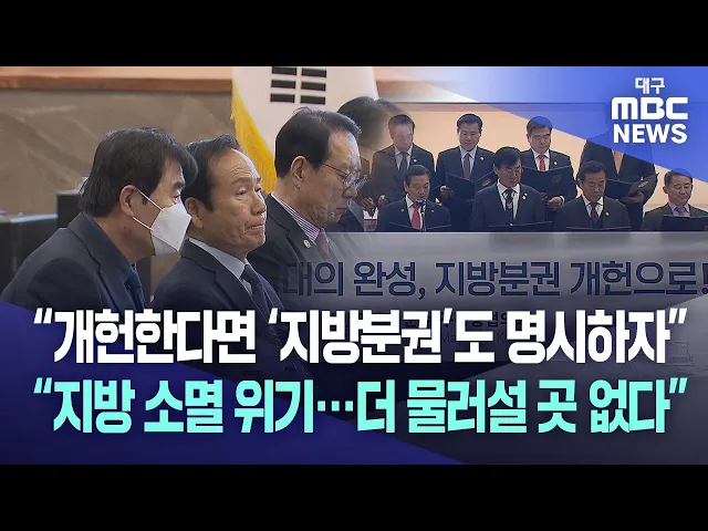 ◀앵커▶비상계엄 사태 이후 대통령 권한에 무게 중심이 쏠려 있는 헌법을 빠른 시일 내 손질해야 한다는 주장이 제기되고 있습니다. 이런 가운데 전국 기초자치단체장들이 개헌하려거든 지방분권에 관한 내용도 헌법에 명시하자는 목소리를 내고 있습니다. 보도에 권윤수 기자입니다.◀기자▶저출생·고령화, 청년 유출, 지방 ...